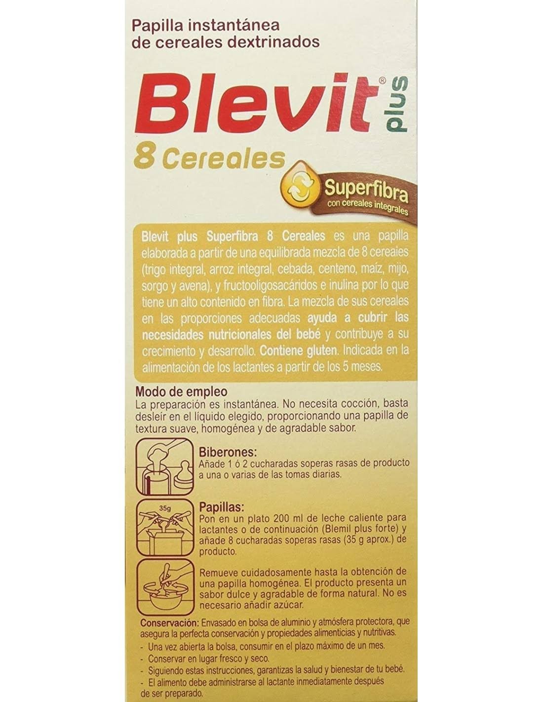 Blevit Plus 8 Cereales S/F 600 G está elaborado a base de una equilibrada mezcla de 8 cereales (maíz, arroz, avena, cebada, centeno, mijo, sorgo y trigo). Es un producto sin gluten, sin azúcares añadidos y con un alto contenido en fibra.